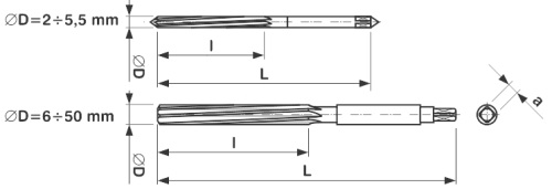 Workmanship: Material: high-speed HSS.Workmanship with left hand helix 7° and uniform pitch. Diameter of the shank is equal with Ø D in tolerance f8. Reamers are produced for holes in size tolerances H7 and H8, contingently according customer´s wish. Usability: Reaming clear holes by repairing and piece work for all non-ferrous metal and ferrous metal, their alloys and plastics. |